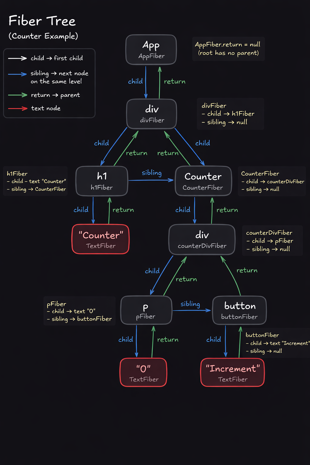 child,sibling,return. These are pointers. They connect fibers to other fibers, forming a linked list.